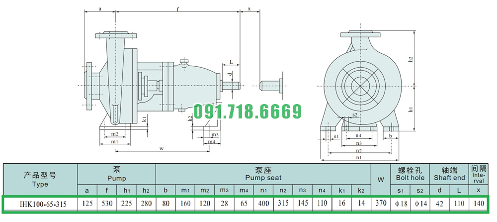 Kích thước của đầu máy bơm cánh hở li tâm trục ngang IHK100-65-315 inox 316
