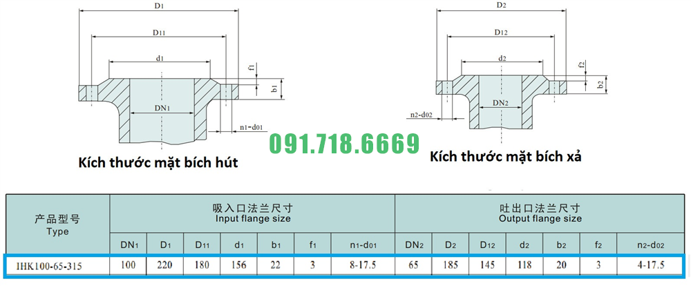 Kích thước mặt bích của máy bơm cánh hở li tâm trục ngang IHK100-65-315 inox 316