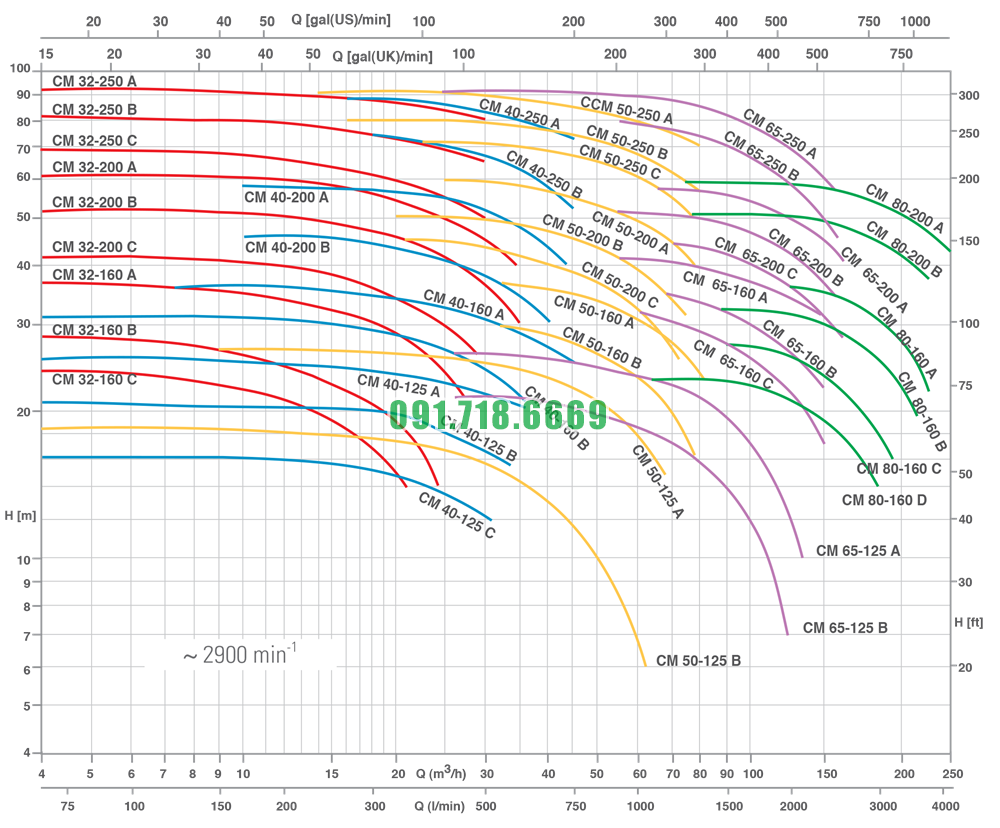 Đường cong hiệu suất máy bơm nước sạch li tâm trục ngang CM40-160A đường thoát 40 mm