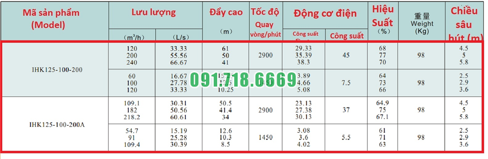 Bảng lưu lượng của máy bơm cánh hở li tâm trục ngang IHK125-100-250 vật liệu inox 316