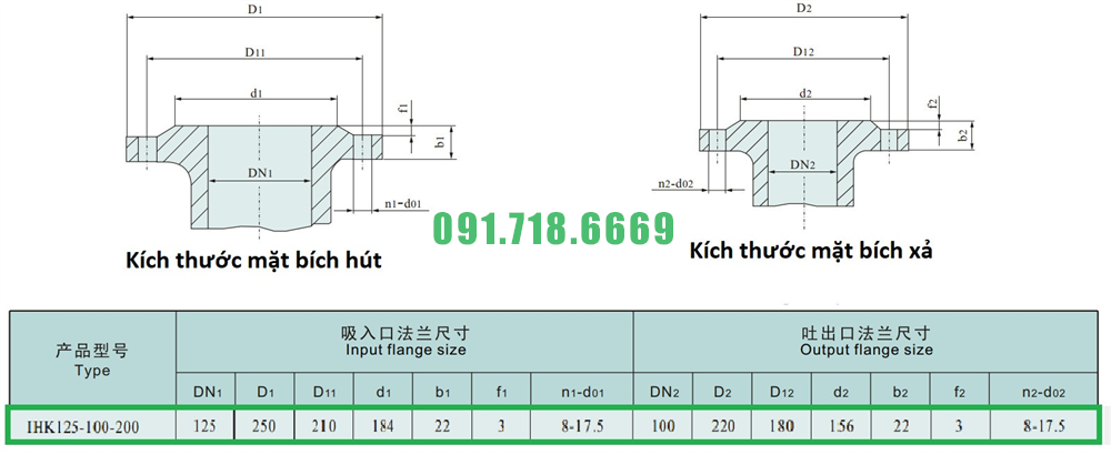 Kích thước mặt bích của máy bơm cánh hở li tâm trục ngang IHK125-100-250 vật liệu inox 316