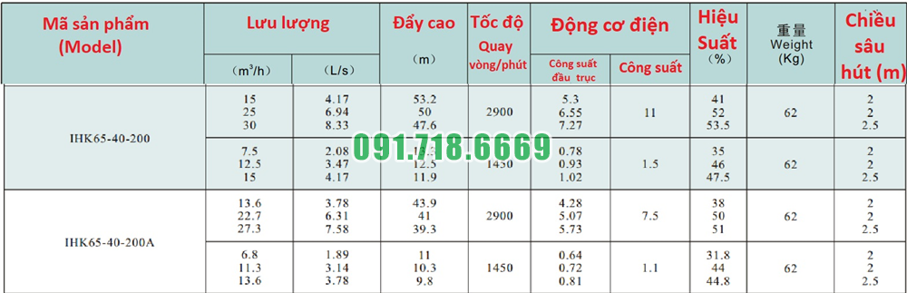 Bảng lưu lượng của máy bơm cánh hở li tâm trục ngang IHK65-40-200 đường thoát 40 mm