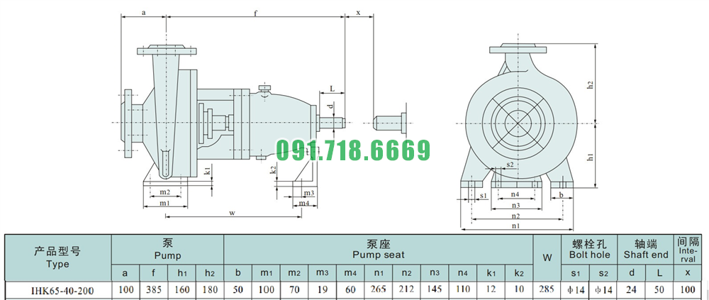 Kích thước của đầu máy bơm cánh hở li tâm trục ngang IHK65-40-200 đường thoát 40 mm