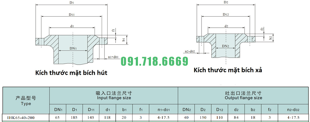 Kích thước mặt bích của máy bơm cánh hở li tâm trục ngang IHK65-40-200 đường thoát 40 mm