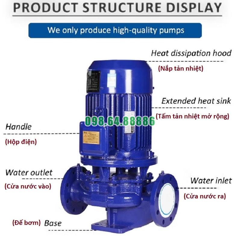 Vị trí trục đứng: Bánh công tác được gắn trực tiếp trên trục động cơ, thẳng hàng với ống hút và ống xả, nên dòng chảy đi qua gần như không đổi hướng → tổn thất áp suất thấp.