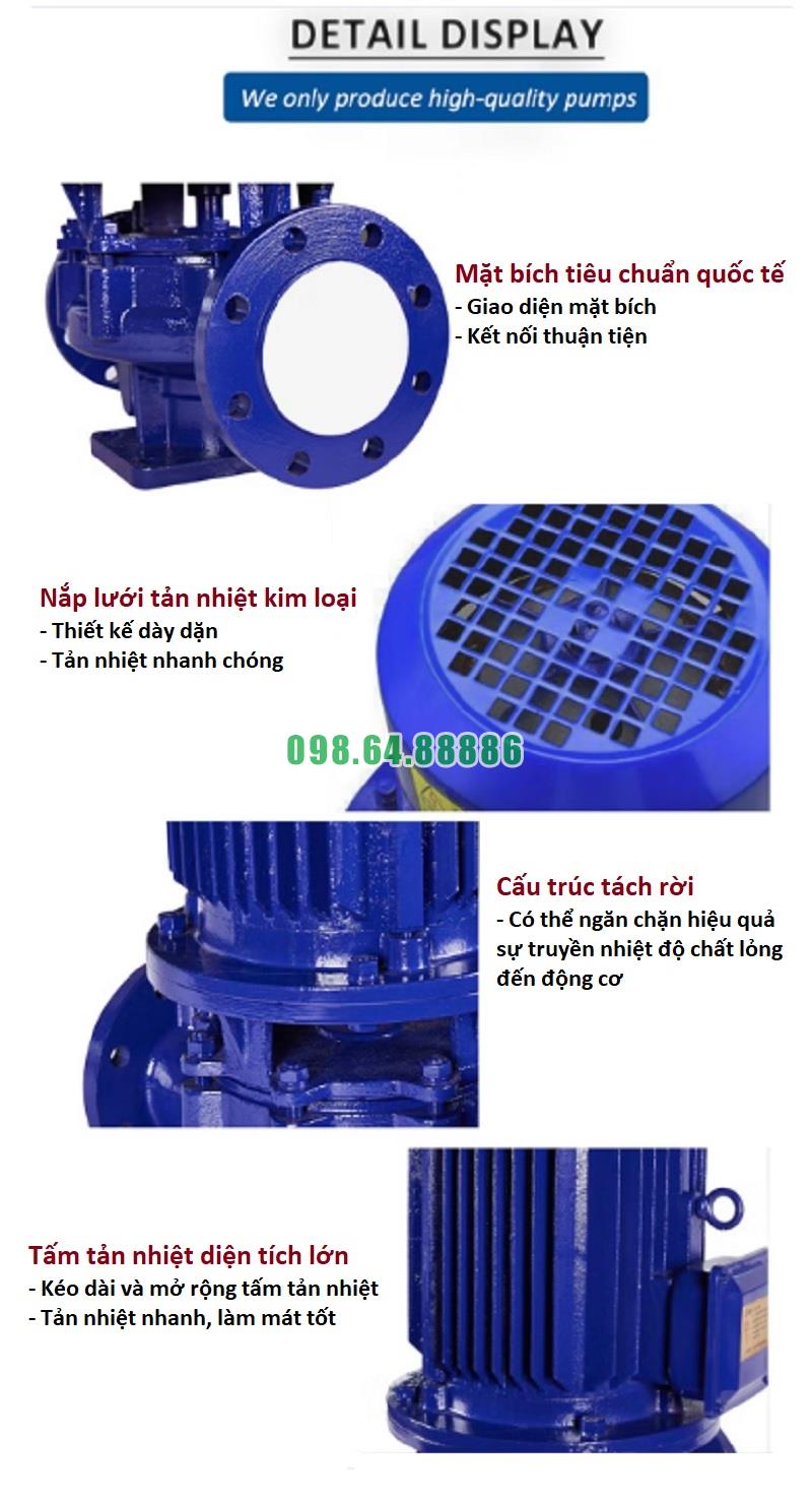 Nhờ đó, bơm chỉ chiếm diện tích mặt bằng rất nhỏ, rất phù hợp với không gian hẹp, như các phòng kỹ thuật tầng hầm, trạm bơm trong nhà máy, khách sạn, chung cư cao tầng.