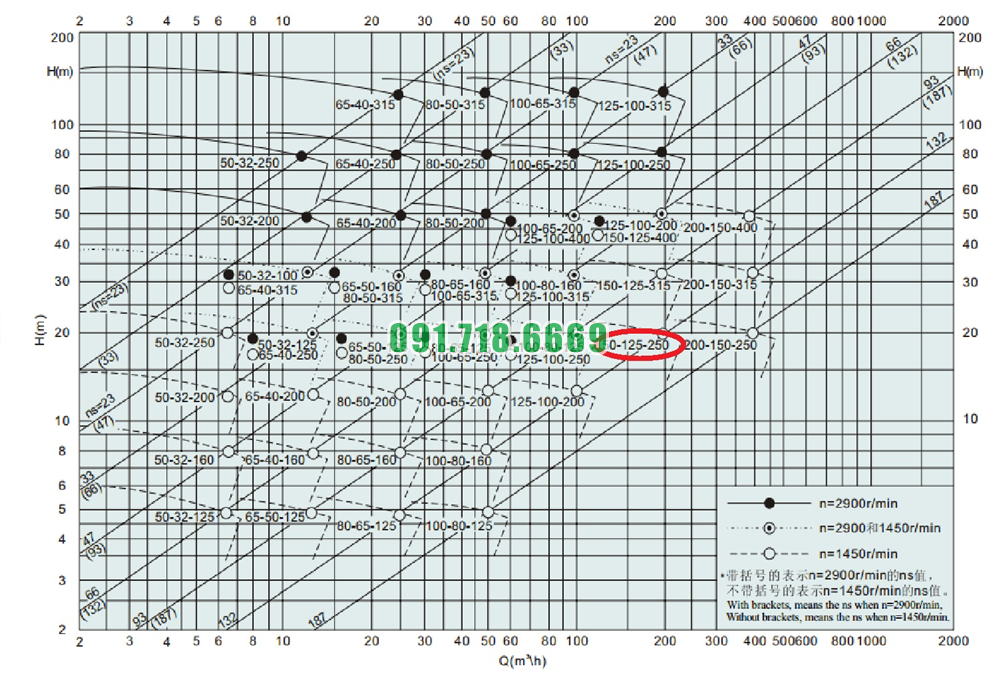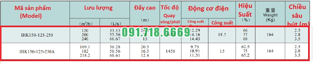 Bảng lưu lượng của máy bơm nước li tâm trục ngang cánh hở IHK150-125-250 kích thước Dn125
