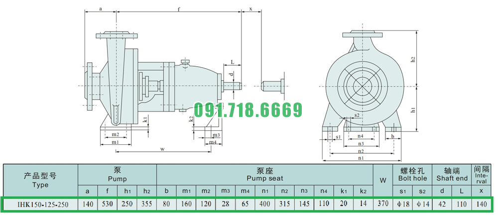 Kích thước của đầu máy bơm nước li tâm trục ngang cánh hở IHK150-125-250 kích thước Dn125