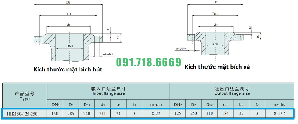 Kích thước mặt bích của máy bơm nước li tâm trục ngang cánh hở IHK150-125-250 kích thước Dn125