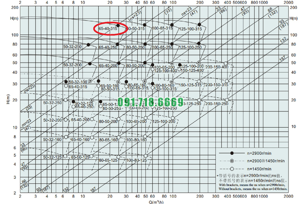 Bảng lưu lượng của máy bơm nước li tâm trục ngang cánh hở IHK65-40-315 kích thước Dn65