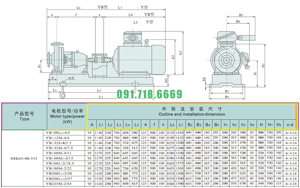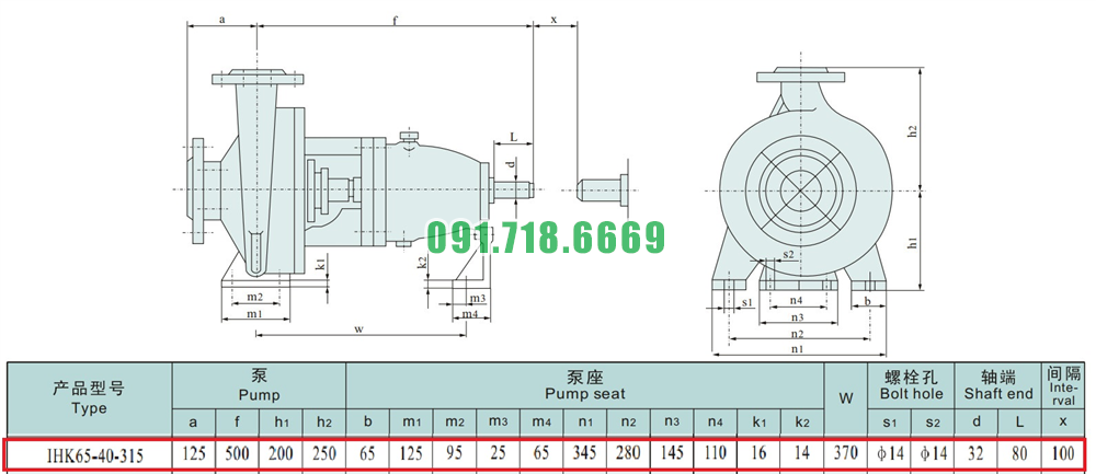 Kích thước của đầu máy bơm nước li tâm trục ngang cánh hở IHK65-40-315 kích thước Dn65
