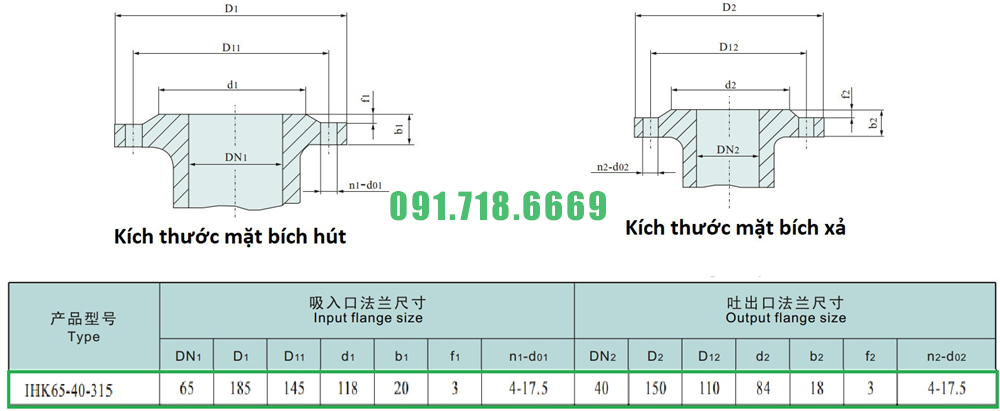 Kích thước mặt bích của máy bơm nước li tâm trục ngang cánh hở IHK65-40-315 kích thước Dn65