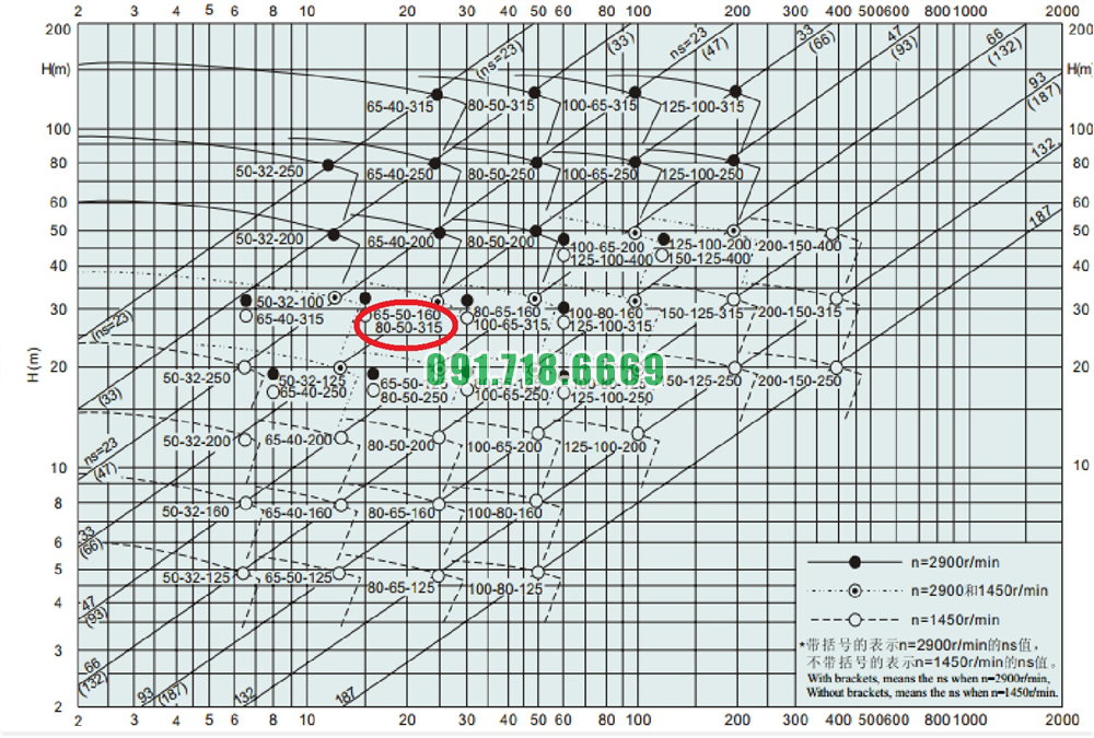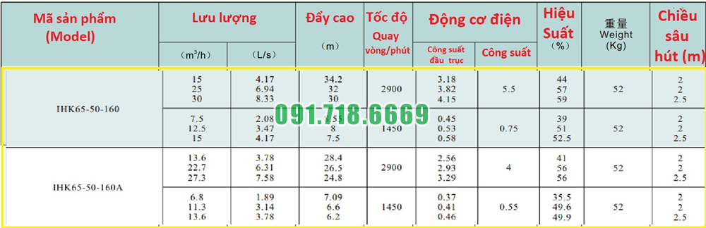 Bảng lưu lượng của máy bơm nước li tâm trục ngang cánh hở IHK65-50-160 kích thước Dn65