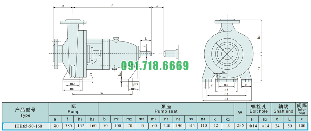 Kích thước của đầu máy bơm nước li tâm trục ngang cánh hở IHK65-50-160 kích thước Dn65