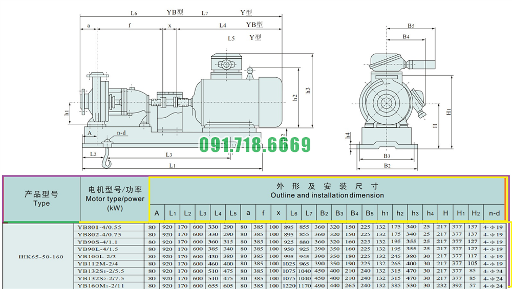 Kích thước lắp đặt của máy bơm nước li tâm trục ngang cánh hở IHK65-50-160 kích thước Dn65