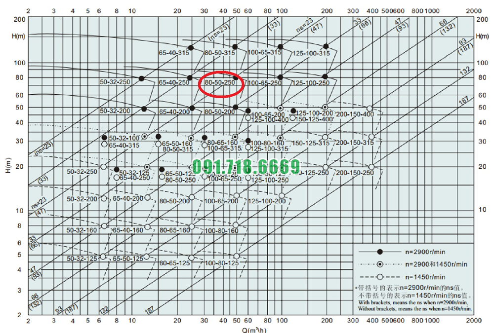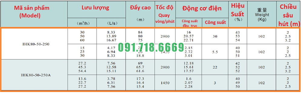 Bảng lưu lượng của máy bơm nước li tâm trục ngang cánh hở IHK80-50-250 hiệu suất 13-60 m3/h