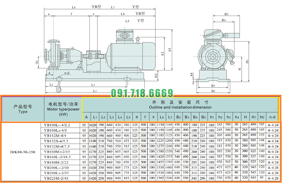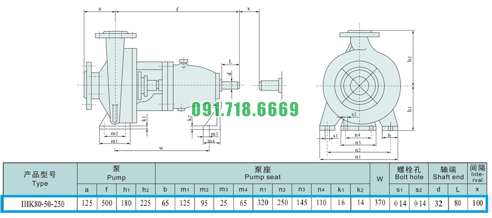 Kích thước của đầu máy bơm nước li tâm trục ngang cánh hở IHK80-50-250 hiệu suất 13-60 m3/h