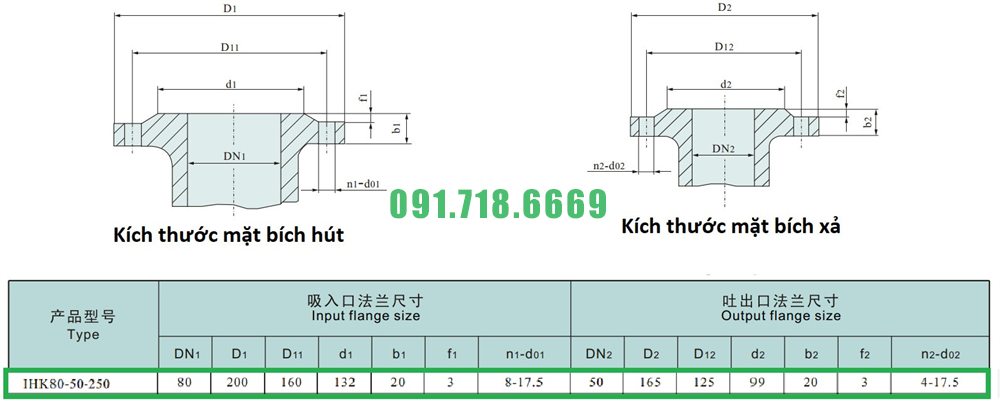 Kích thước mặt bích của máy bơm nước li tâm trục ngang cánh hở IHK80-50-250 hiệu suất 13-60 m3/h