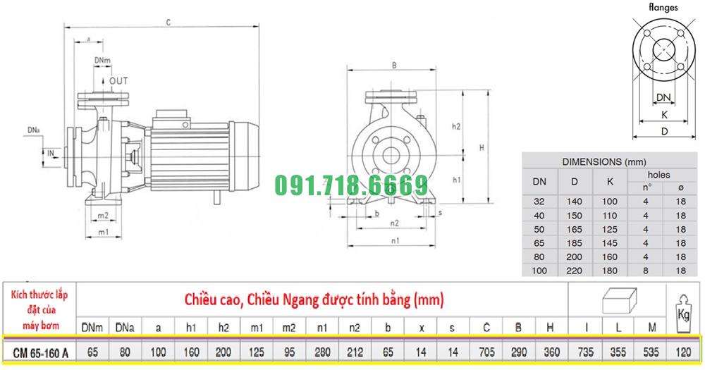 Kích thước máy bơm nước li tâm trục ngang CM65-160A vỏ gang FC200