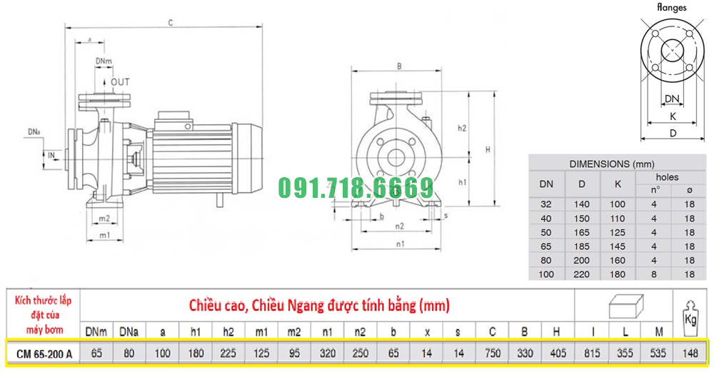 Thông số kỹ thuật máy bơm nước li tâm trục ngang CM65-200A kích thước Dn80
