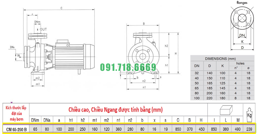 Kích thước máy bơm nước li tâm trục ngang CM65-250B đường thoát 65 mm