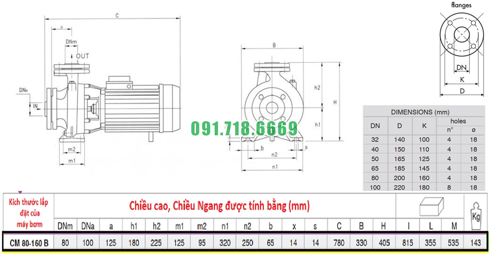 Thông số kỹ thuật máy bơm nước li tâm trục ngang CM80-160A kích thước Dn100