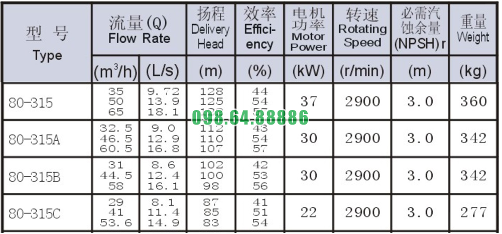 Bảng thông số kỹ thuật bơm nước trục ngang SLW80-ISW80-315 lưu lượng 18.1 L/s